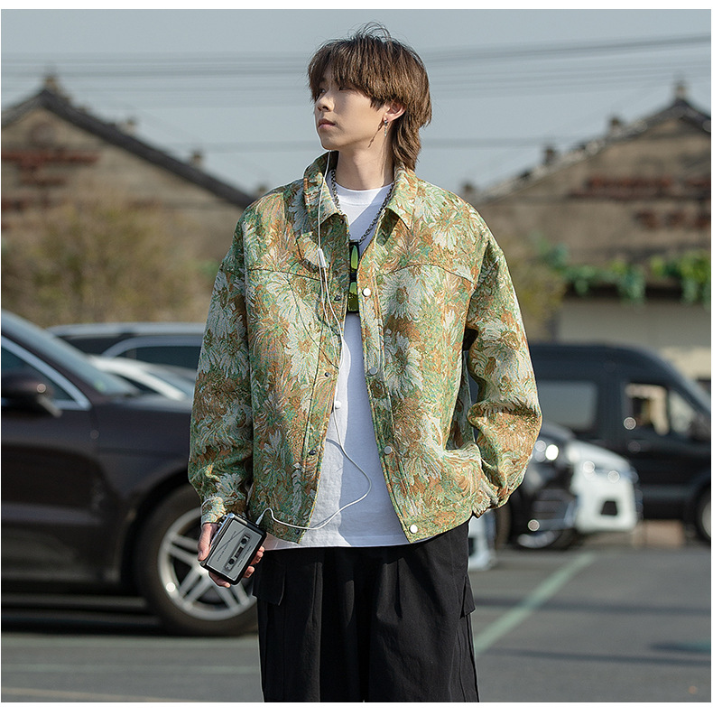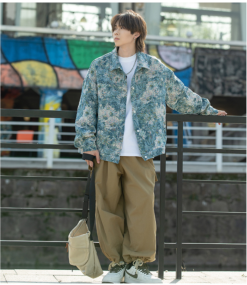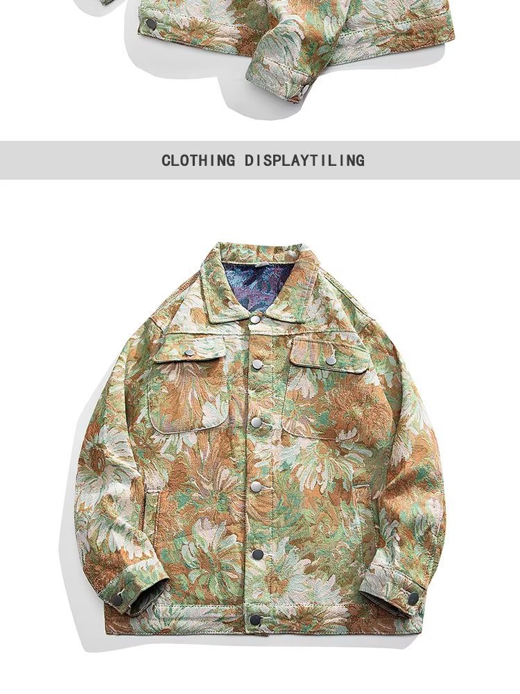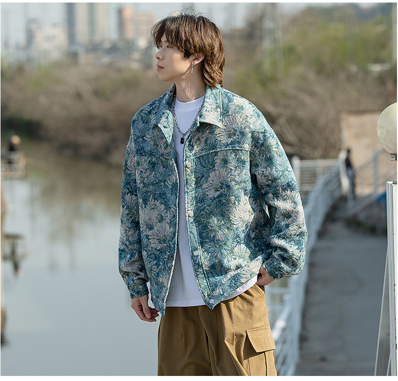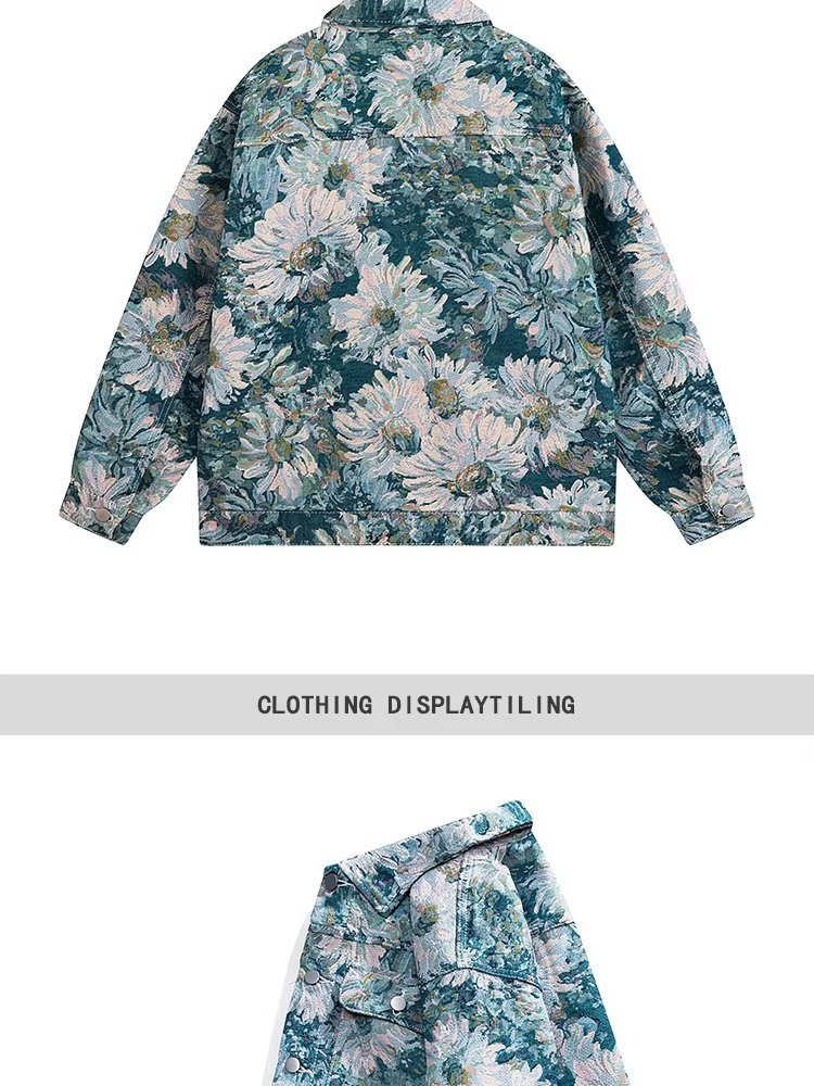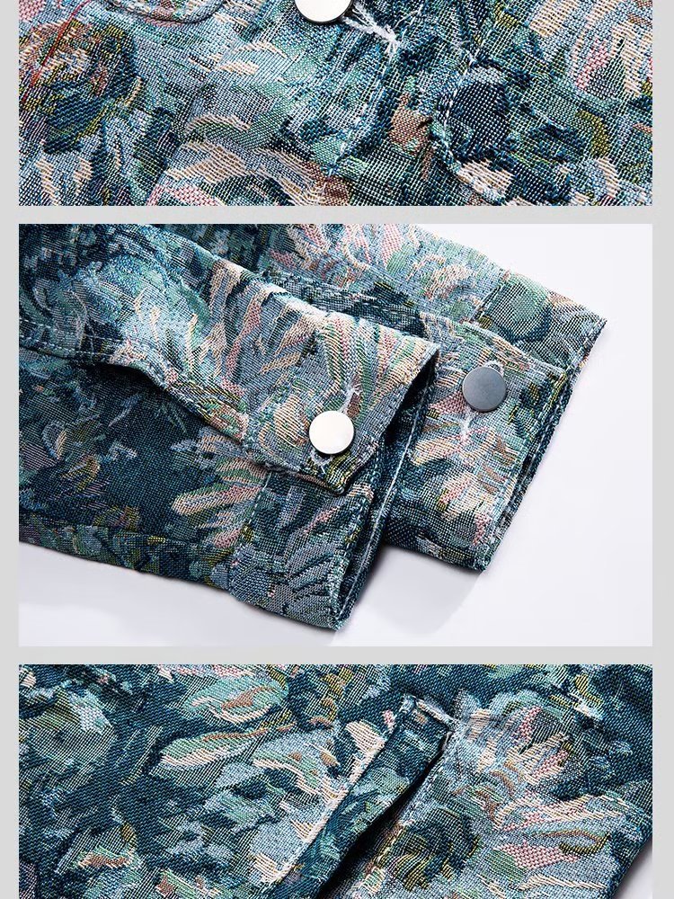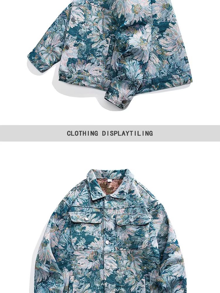 Full Flowers Jacquard Denim Jacket Men Korean Fashion Turndown Collar Jacket Women Loose Couples Casual Coat Autumn 2023
